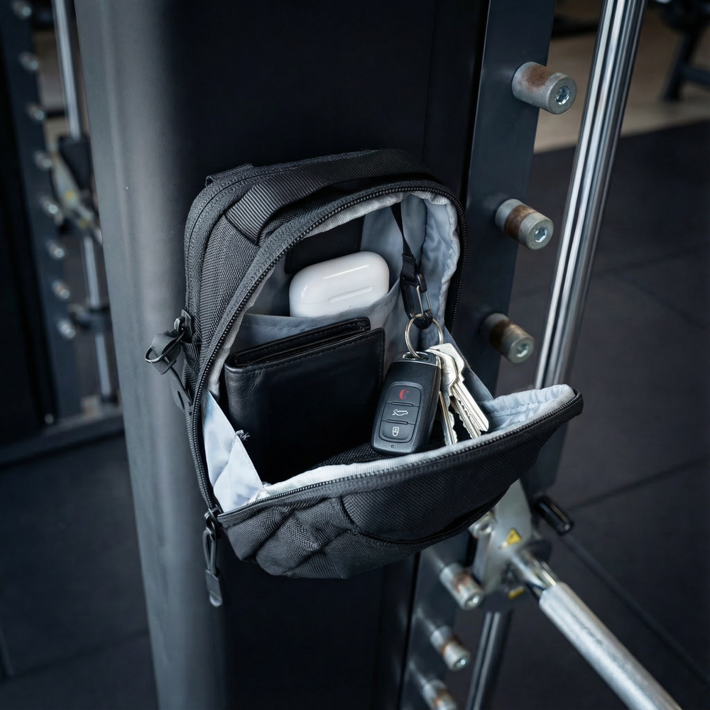 SwiftSling™ is a magnetic gym bag built to elevate your essentials — literally. With a secure magnetic base, padded compartments, and a vertical profile made for movement, it keeps your phone and gear off the gym floor and within reach.